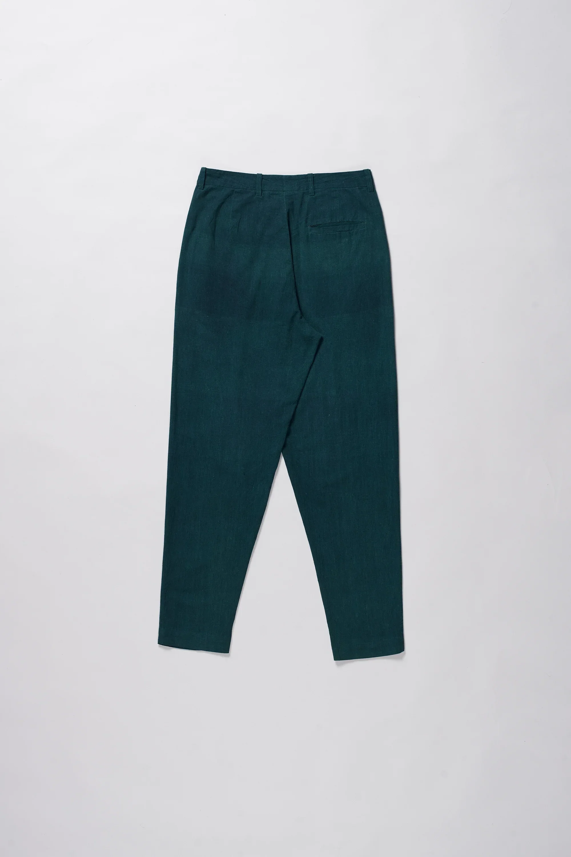 A regular fit pleated pants with tapered bottom. Crafted with carefully composed panels of 40's count handspun and handwoven fabric in bottle green.