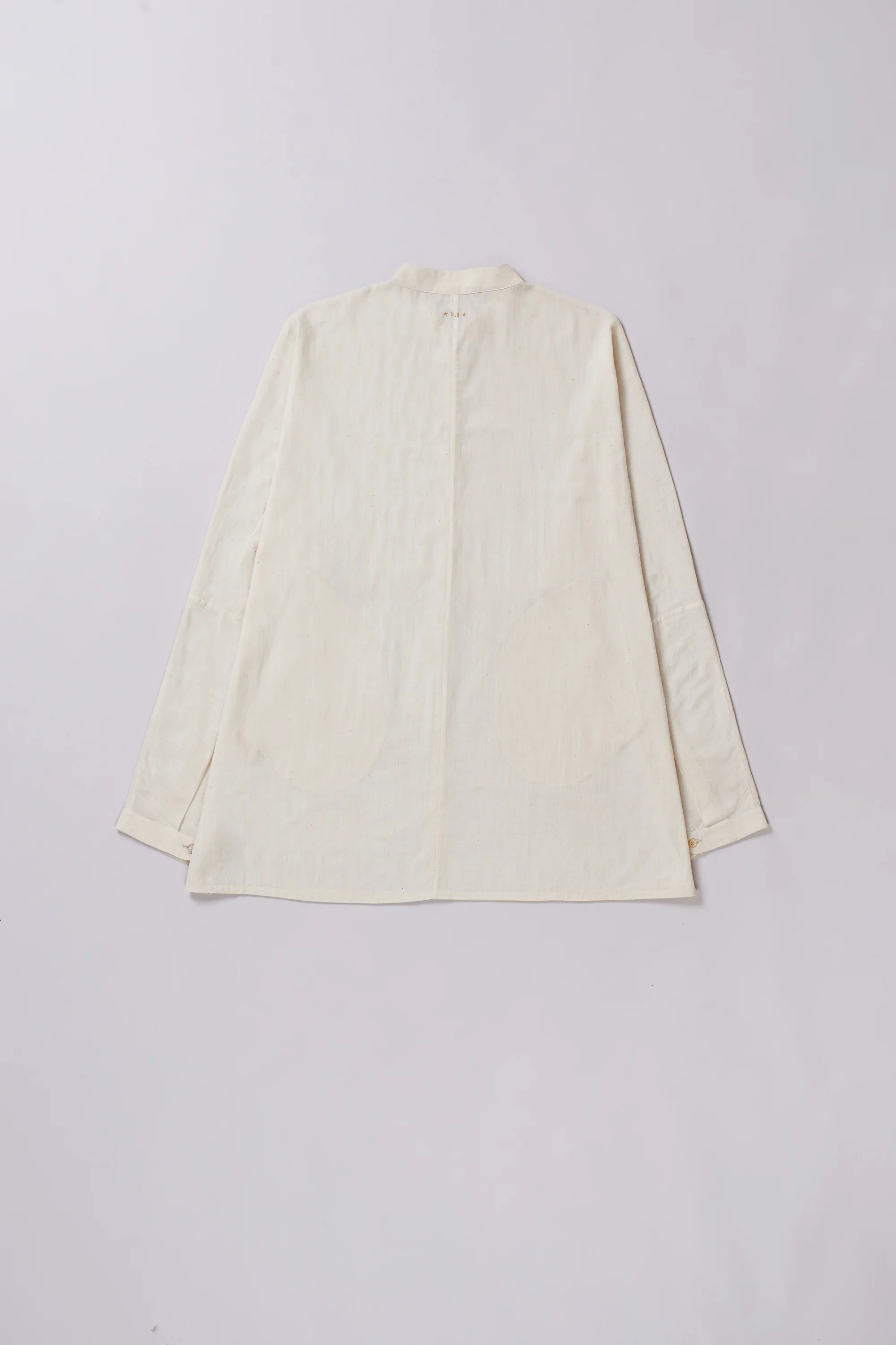 Crafted from 200s count handspun cotton, this shirt features a relaxed fit with a band collar, narrow shoulders, kimono-style sleeves, and delicate hand embroidery.