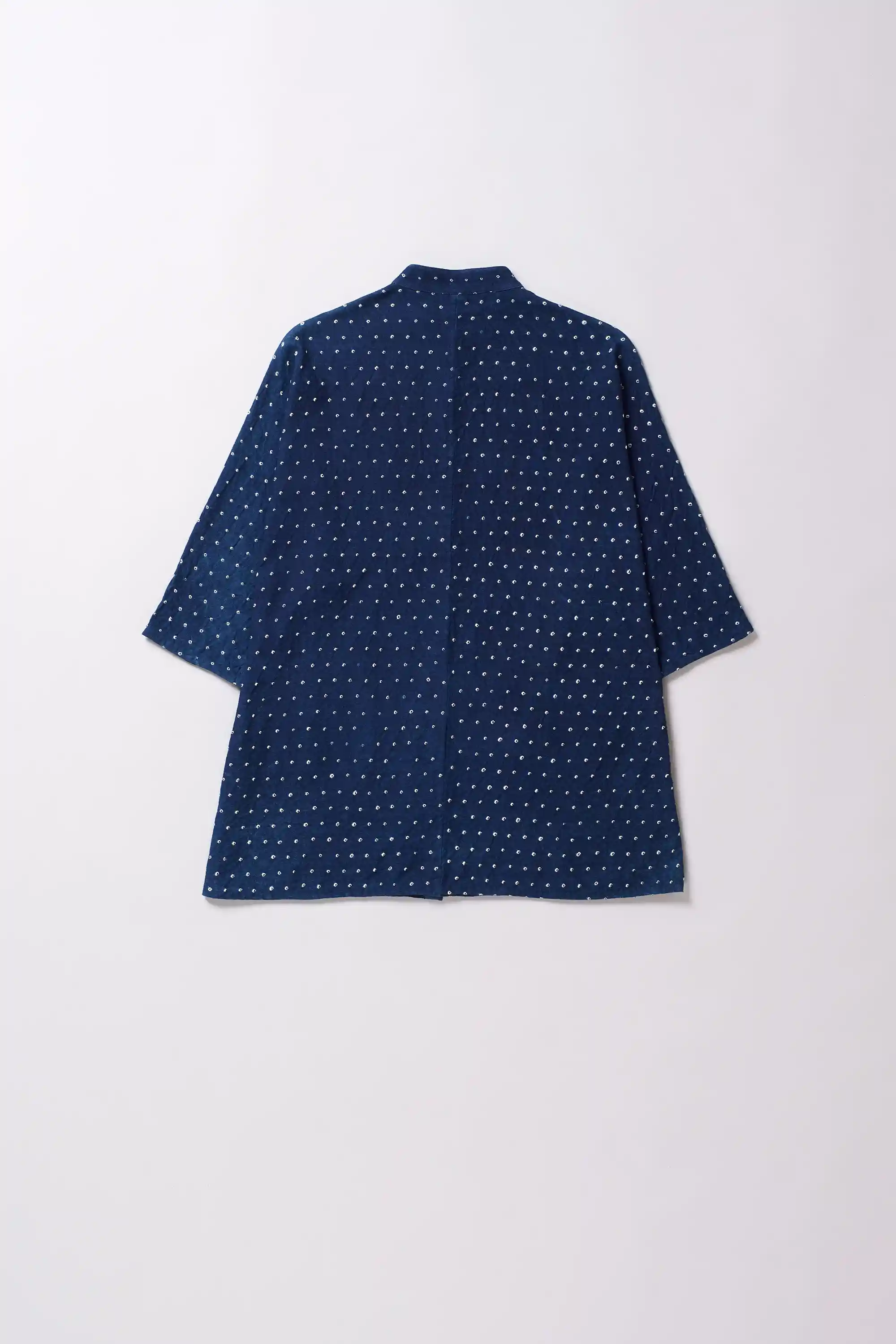 Unisex shirt with kimono-inspired sleeves crafted with handspun and handwoven fabric. Speckled with miniature all-over Bandhani, the garment is lightweight and breathable.