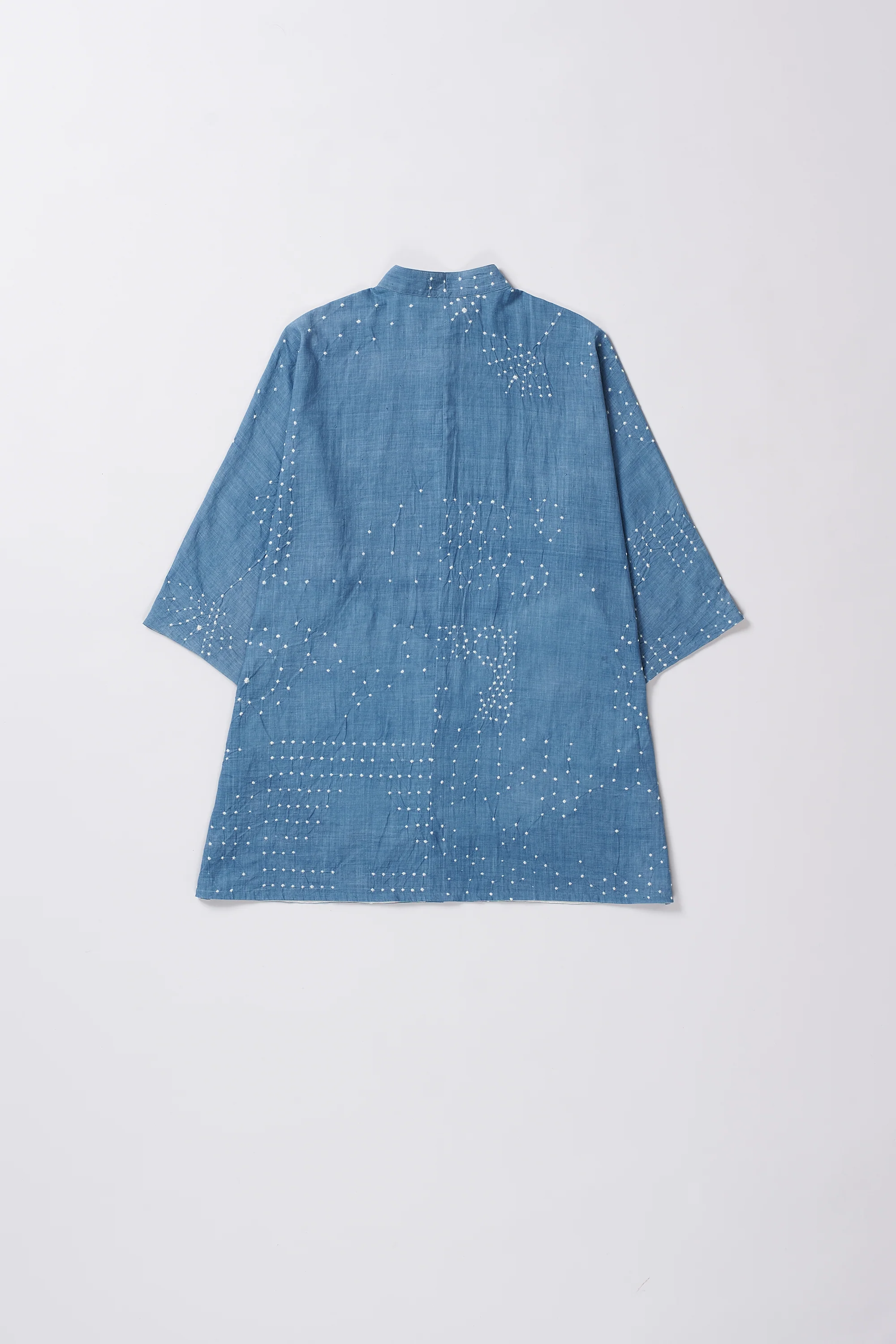 Unisex kimono sleeve shirt made in fine handwoven cotton. Featuring bandhani accents in light indigo.