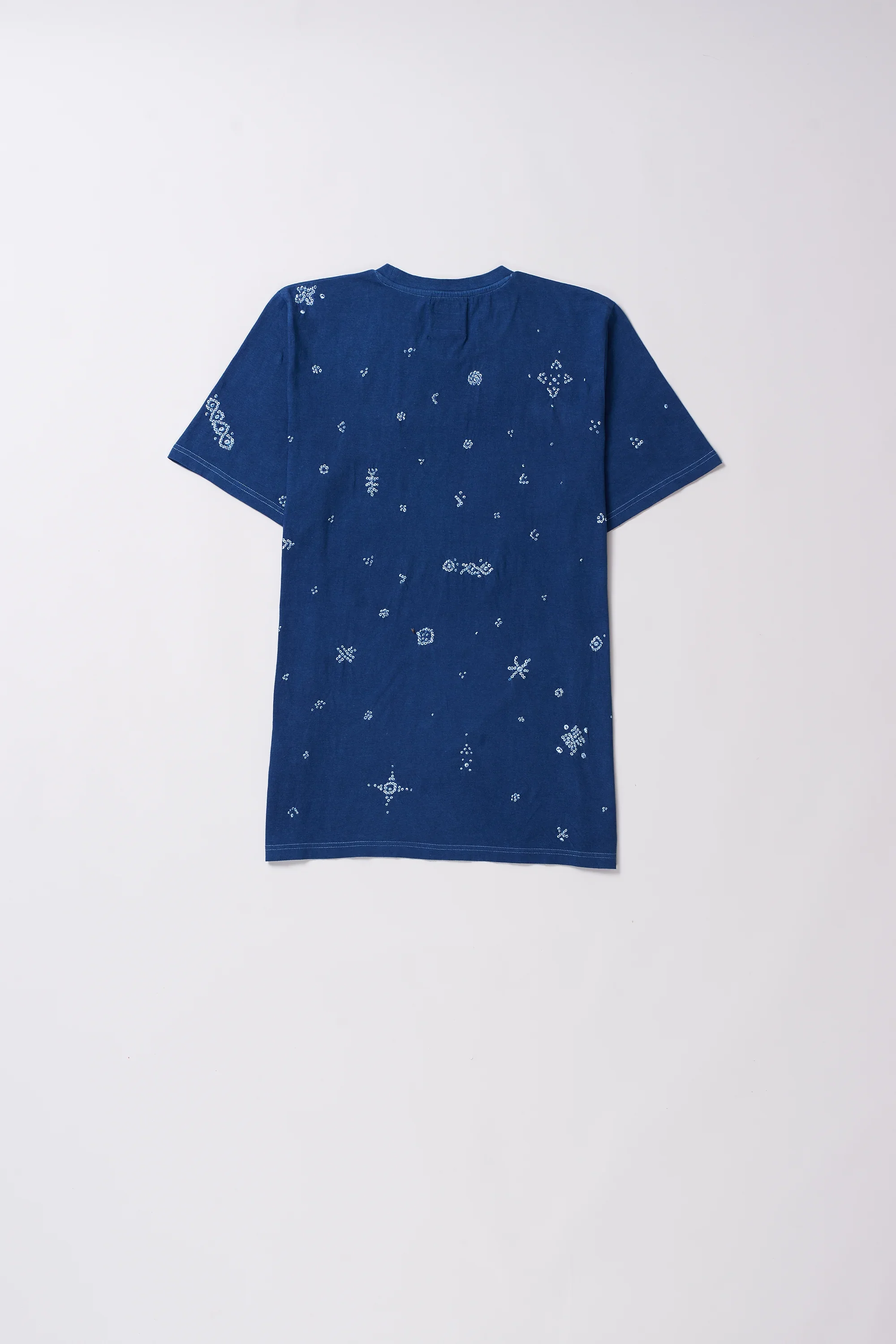 Unisex T-shirt in organic cotton, highlighted with bandhani dot patterns and finished in a medium indigo.
