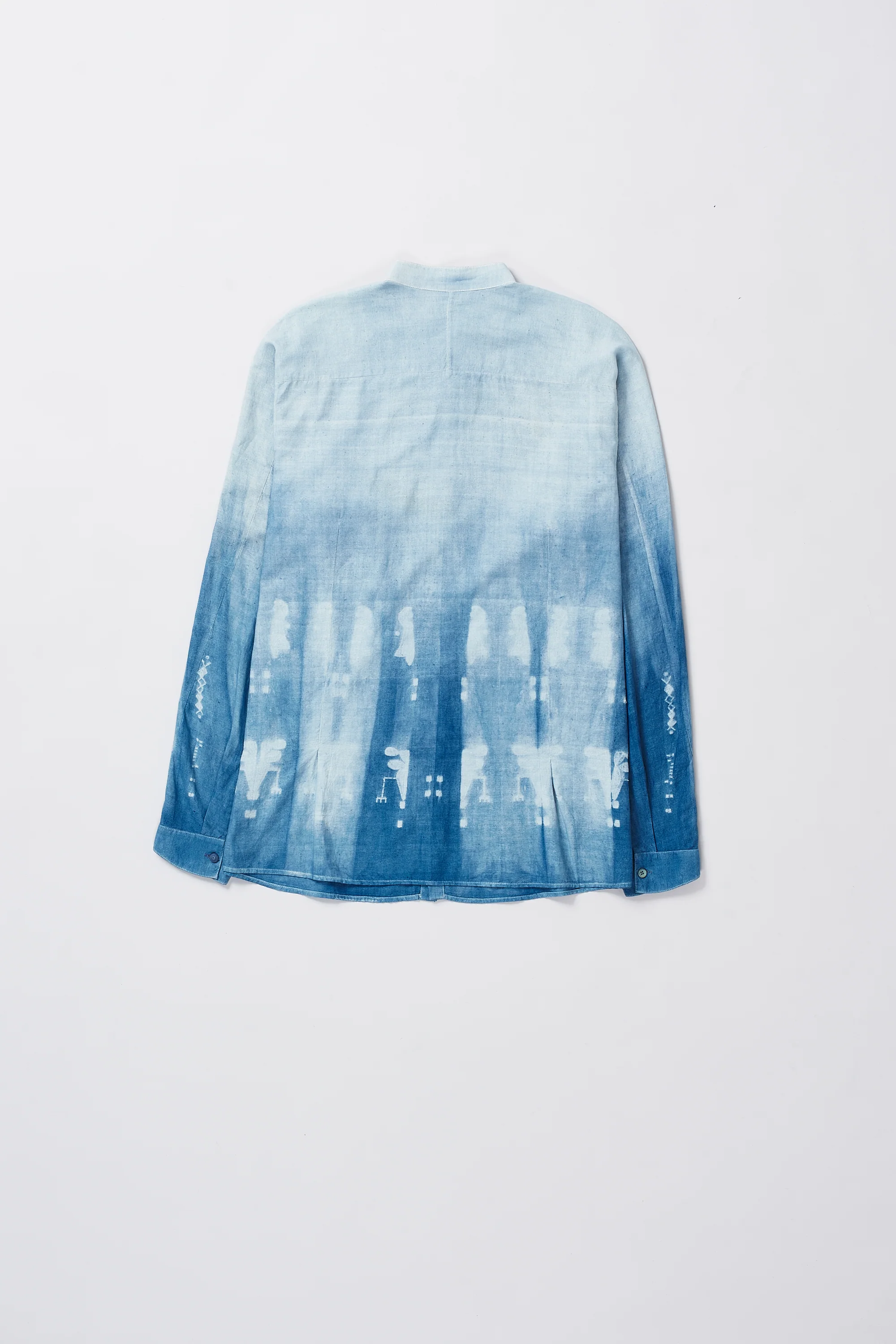 A reimagined classic men's shirt with engineered sleeves and an accentuated cuff. Crafted with fine handwoven basket weave cotton, punctuated with a unique pattern of shibori motifs and ombre dyed in medium indigo.