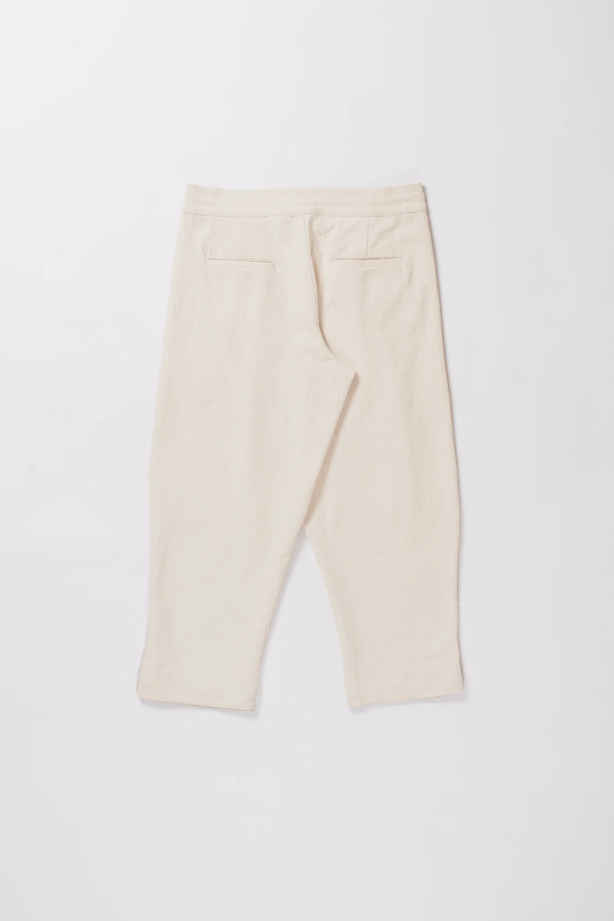 A comfort-driven pair of trousers having an elasticated waistband and wide legs. Crafted with undyed handspun and hand-woven basket weave organic cotton.