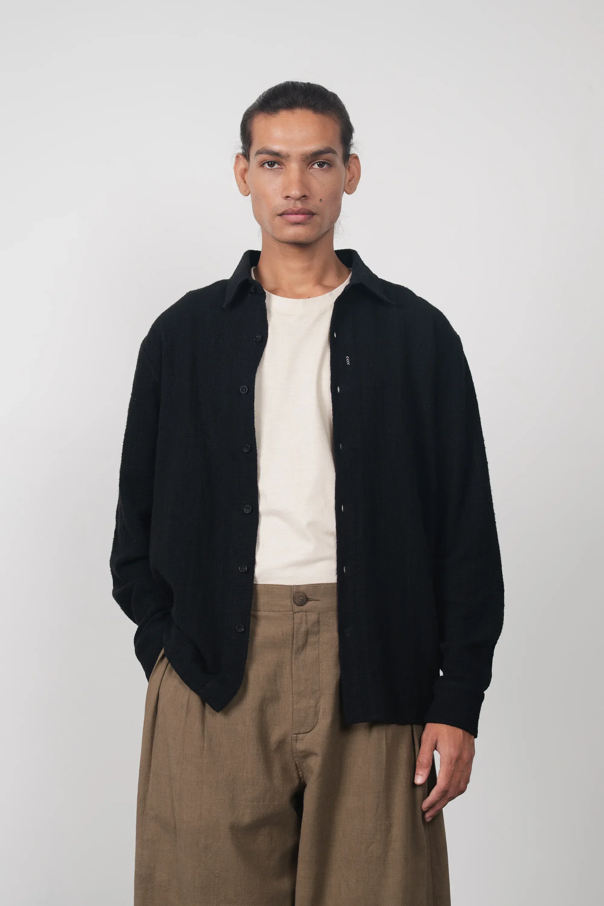 Relaxed fit statement shirt crafted with handspun and handwoven kala indigenous cotton, dyed in black ,amplified with intricate hand-embroidered detailing.